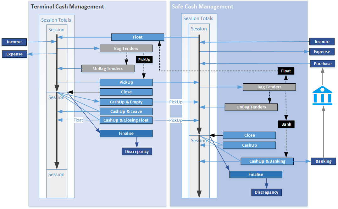 Cash management is made up of 2 types of management: safe management, and terminal management. Safe management transactions will affect one or more store safe entities, while terminal management transactions will affect a single terminal, pay point, or cashier.