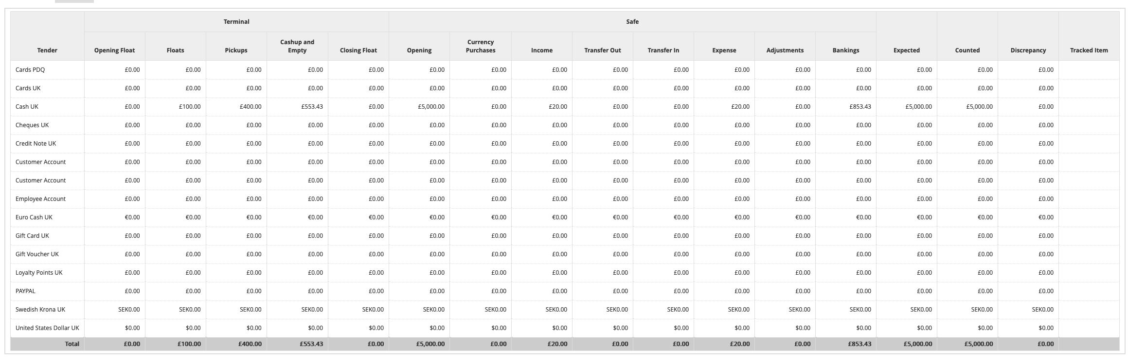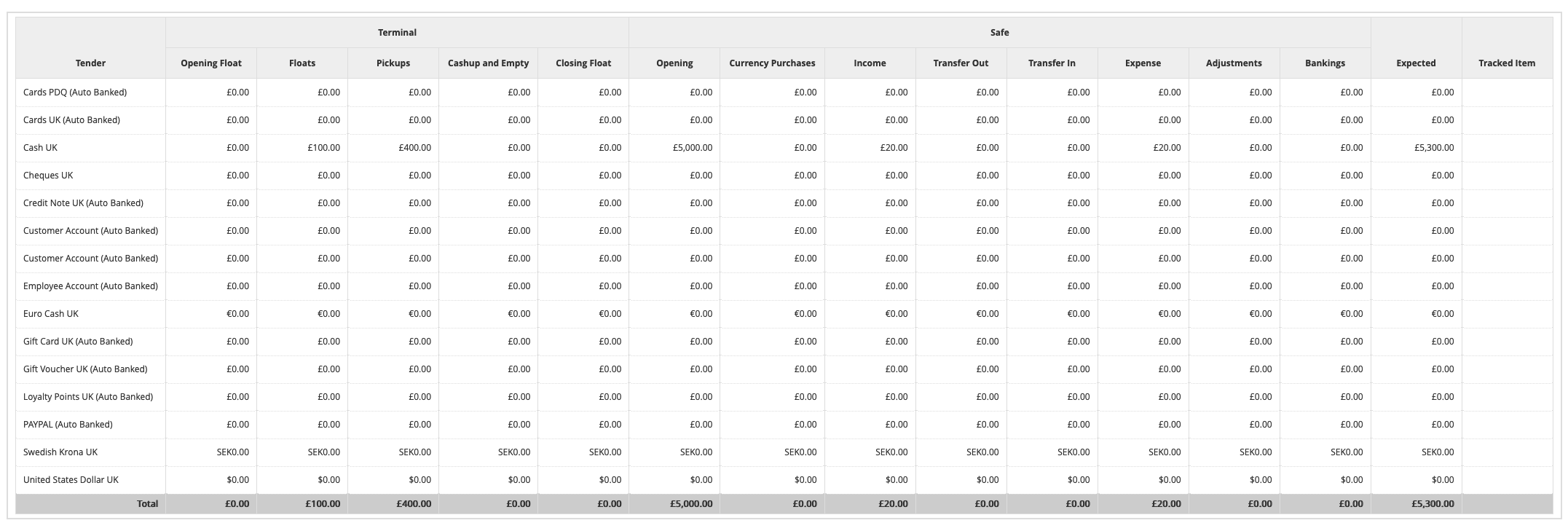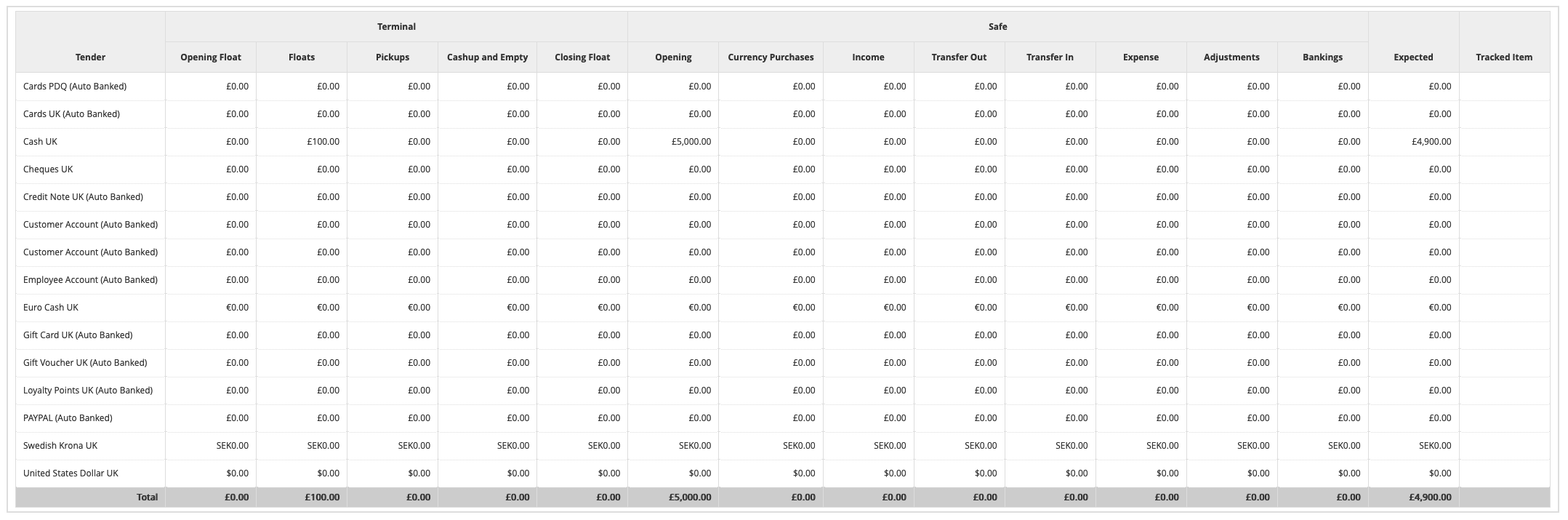 - A cash-up amount (which may be committed to a safe)