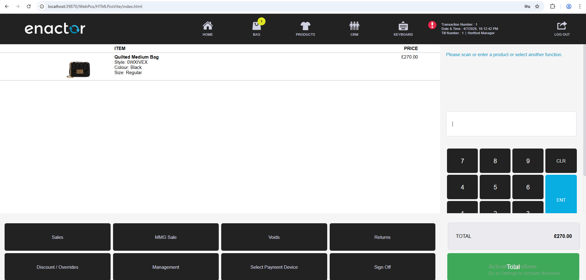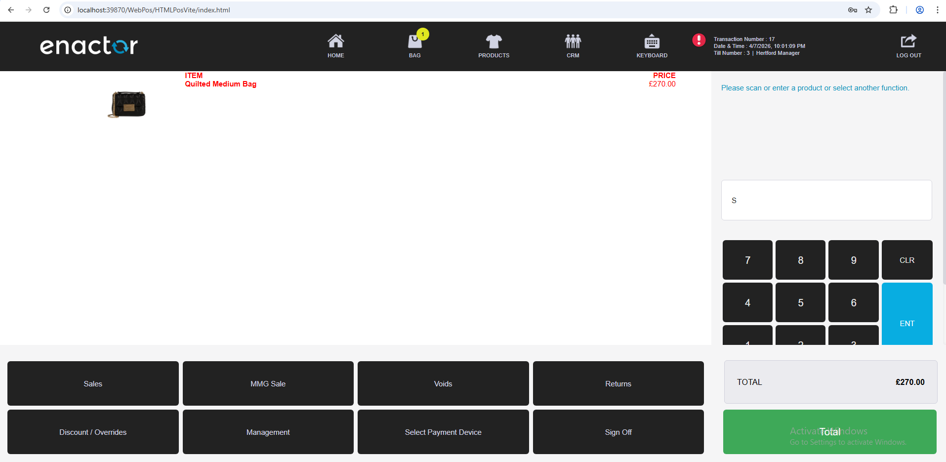 In this task we will override the BasketRow component. Start by logging into the WebPos and adding product 0WXIVEX to the basket.